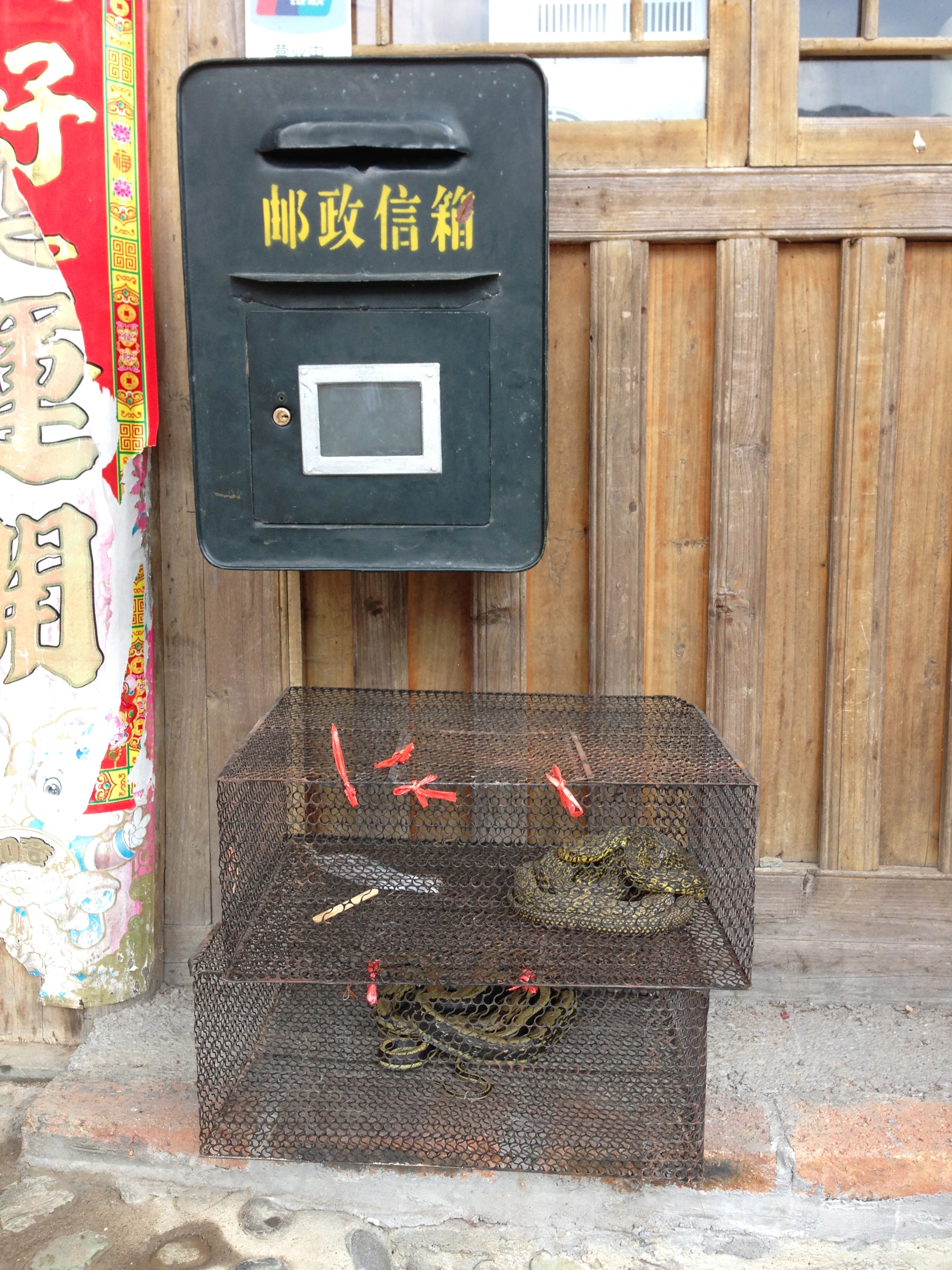 We soon reach the next town, (after taking a left in the fork in the road that my guide was quick to point out to prove she had earned her fee) and waved goodbye. It was another half hour to Tiantou, a slightly larger town with more tourists. There were plenty of guesthouses with signs promising coffee and beer, and outside one, two cages with long, green snakes curled up inside.